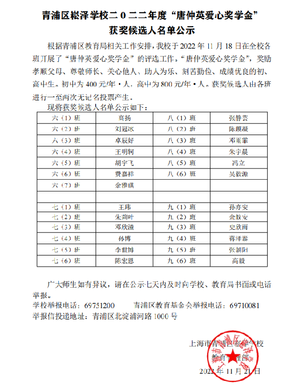 二〇二二年度“唐仲英爱心奖学金” 获奖候选人名单公示