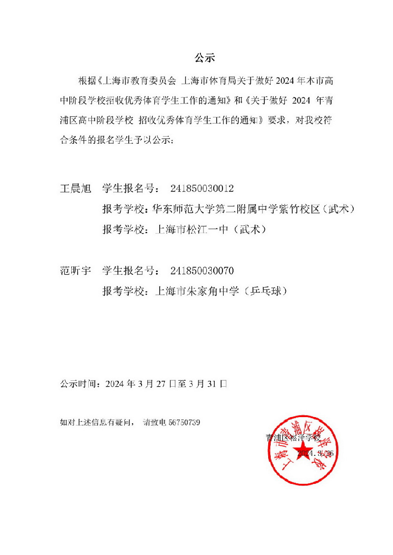 根据《上海市教育委员会 上海市体育局关于做好2024年本市高中阶段学校招收优秀体育学生工作的通知》和《关于做好 2024 年青浦区高中阶段学校 招收优秀体育学生工作的通知》要求,对我校符合条件的报名学生予以公示: